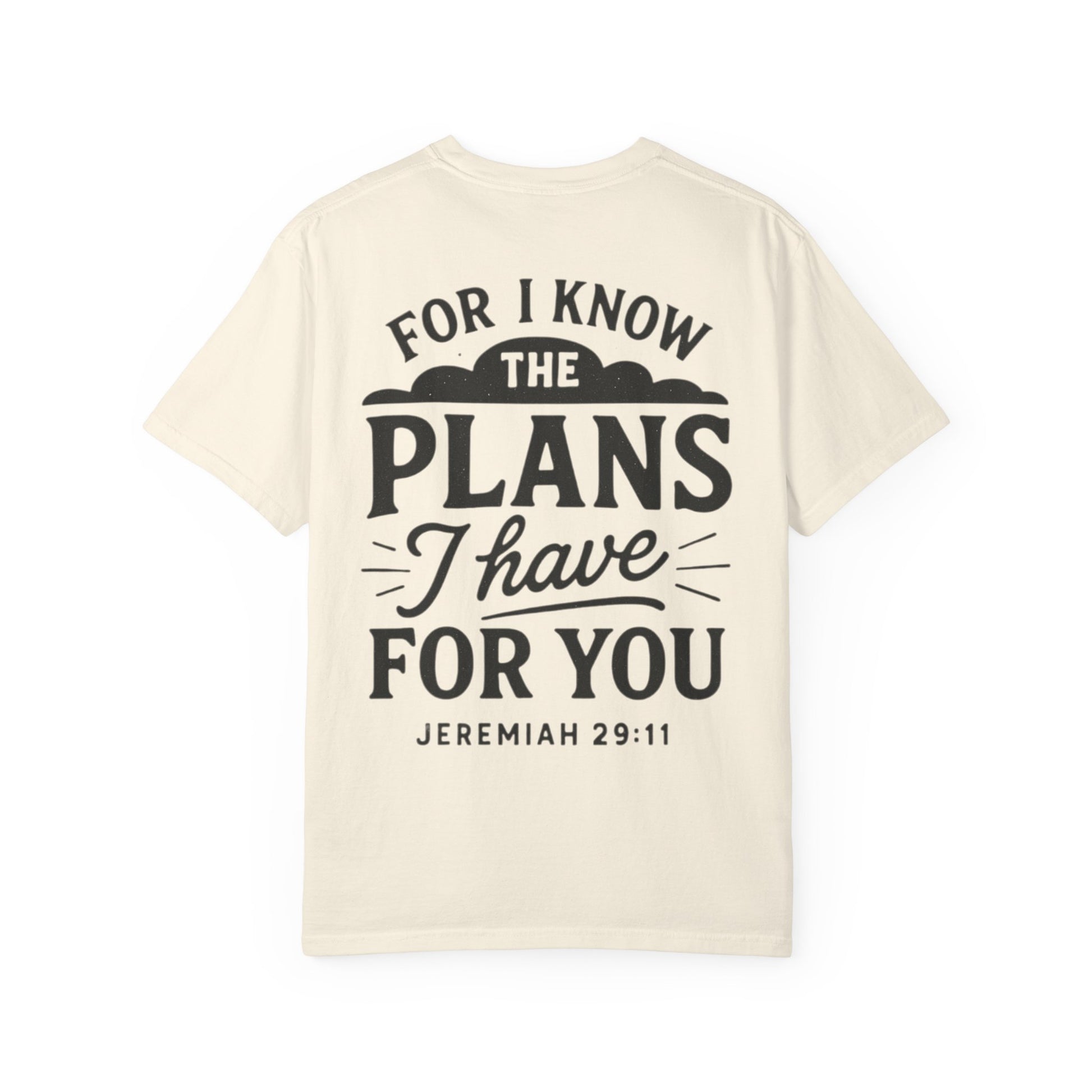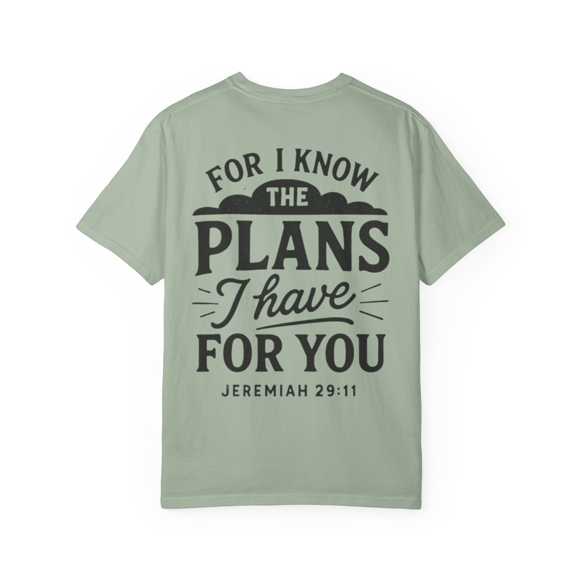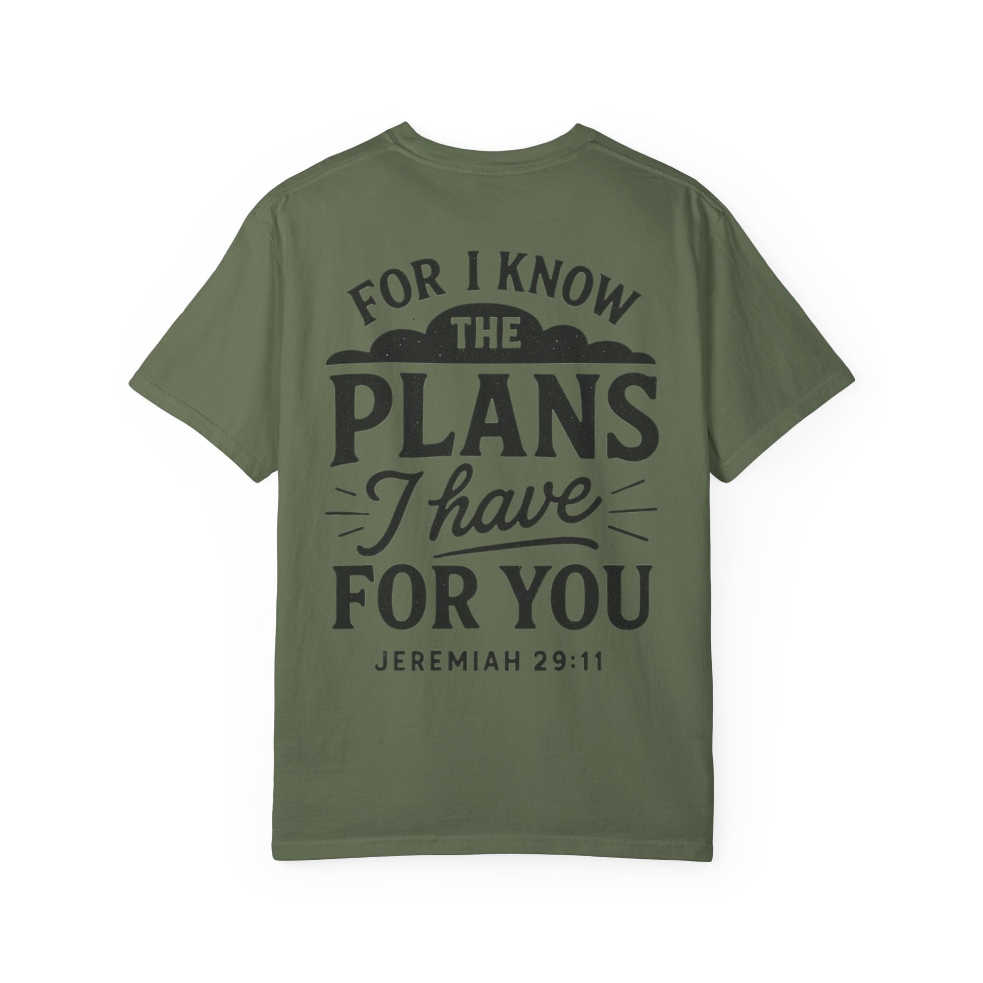 Carry hope and inspiration with you wherever you go in this Jeremiah 29:11 shirt. Featuring the powerful Bible verse, 'For I know the plans I have for you, declares the Lord,' this shirt serves as a reminder that God has a purpose and a plan for your life—one filled with hope and a future. Whether you're at church, running errands, hanging out with friends, or enjoying a casual day at the park, this shirt is the perfect way to share your faith and spread a message of encouragement. Wear it as a bold statement of trust in God's promises, and let it serve as a constant source of motivation and peace throughout your day.