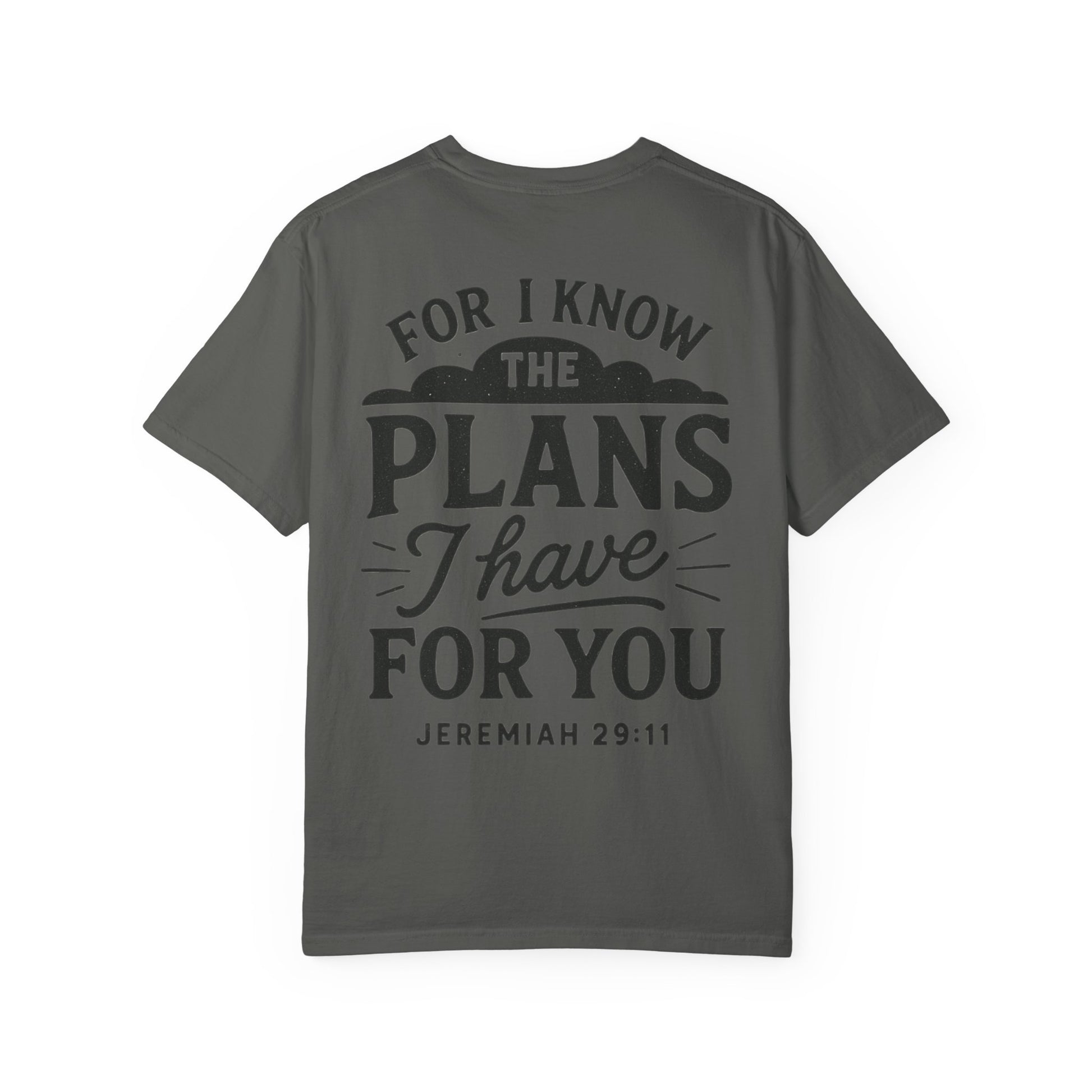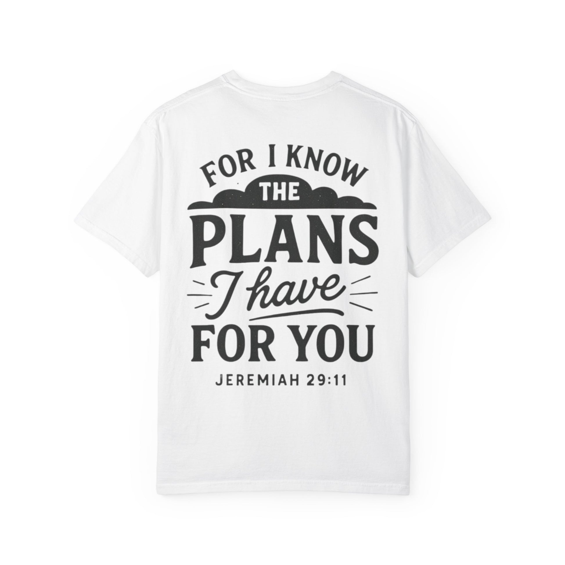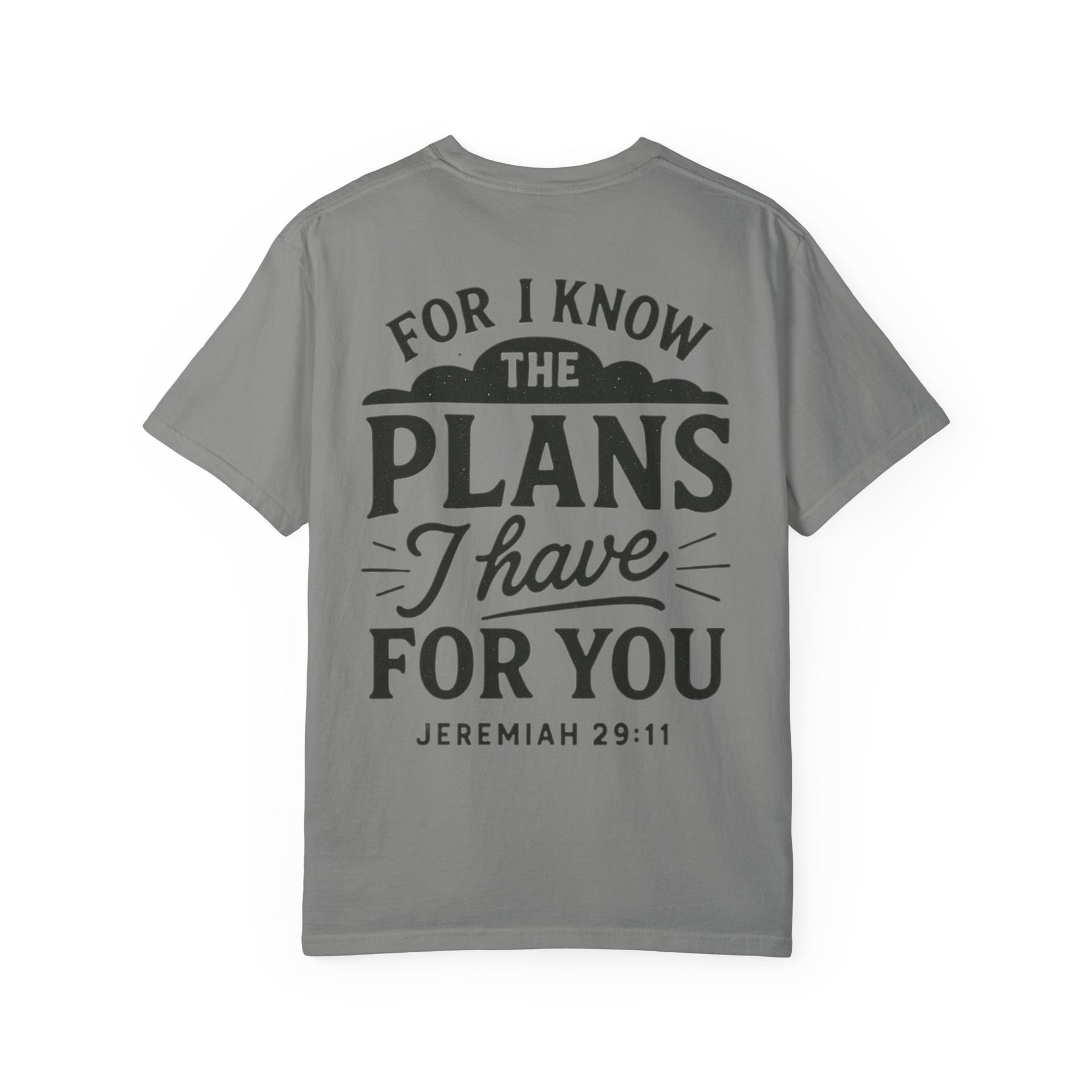 Carry hope and inspiration with you wherever you go in this Jeremiah 29:11 shirt. Featuring the powerful Bible verse, 'For I know the plans I have for you, declares the Lord,' this shirt serves as a reminder that God has a purpose and a plan for your life—one filled with hope and a future. Whether you're at church, running errands, hanging out with friends, or enjoying a casual day at the park, this shirt is the perfect way to share your faith and spread a message of encouragement. Wear it as a bold statement of trust in God's promises, and let it serve as a constant source of motivation and peace throughout your day.