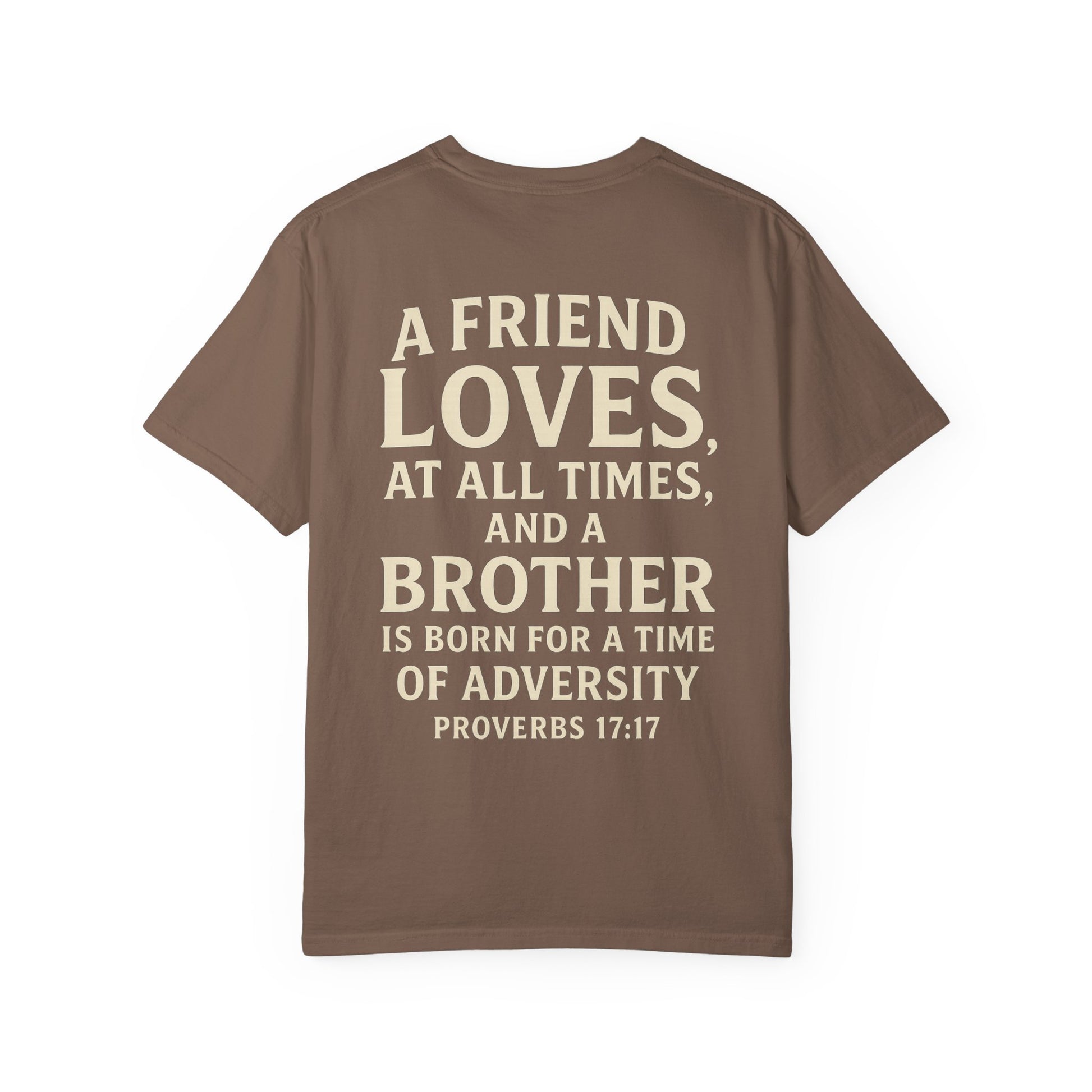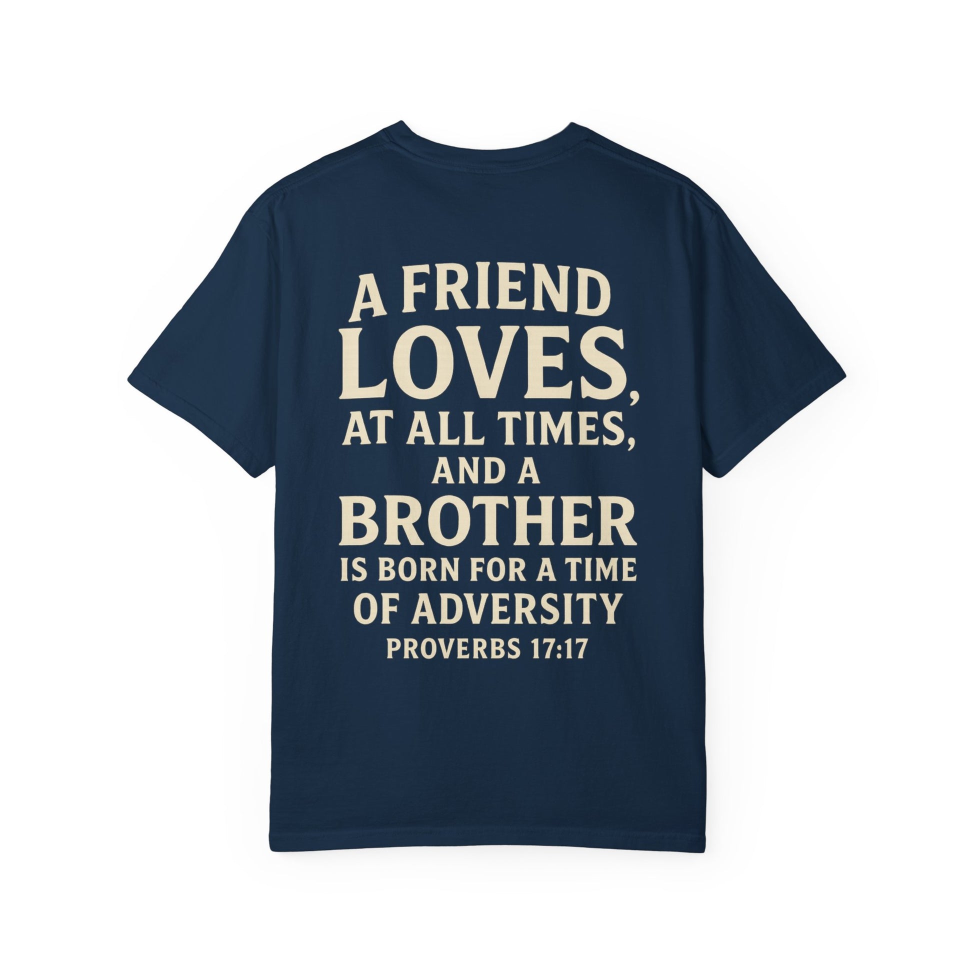 Celebrate loyalty, love, and unshakable brotherhood with this bold yet timeless design inspired by Proverbs 17:17: